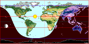 Moon transits about the same time as the Sun. Longitude difference on the map is 0 deg. Moon in conjunction to Sun: Sun Moon and Earth in a line. An eclipse of the Sun occurs when declinations are (nearly) equal. Solar Eclipses: |
