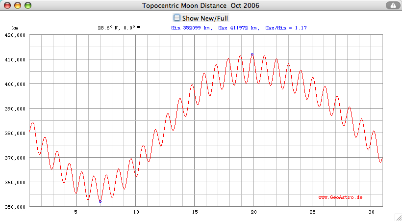The applet is also computing the geocentric and topocentric distance of the Moon from the Earth (accuracy better than +/- 10 km between 1900 and 2050), the apparent angular size (arc minutes), the illuminated fraction of the Moon's disc (per cent), and the Moon's phase: 0.00 = new MoonThe altitude is taking into account the horizontal parallax of the Moon.