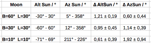 The altitude and azimuth of the Sun as seen from different positions on the Moon (latitude B, longitude L) were compared with Stellarium, using 7 dates (Jul/Aug 2015, at 20 UT). The mean error of the azimuth angle increases for high altitudes: